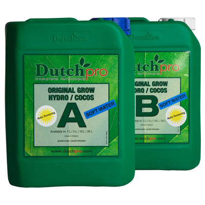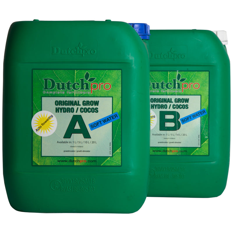 Dutch Pro Auto Flowering Grow Hydro/Coco A&B is a 2-part nutrient specially developed for the vegetative cycle. The Soft Water version is optimized for use in soft water areas. This nutrient is precisely formulated to seamlessly support Auto Flowering plants cultivated in hydroponic systems and coco. Auto Flowering plants have distinct nutritional requirements due to their short growing cycle. This means that to maximize the potential of your plants, every day of their vegetative phase must be fully capitalized on. Dutch Pro Auto Flowering Grow Hydro/Coco contains a sophisticated blend of ingredients that provide all the essential macro and micro nutrients required for robust and healthy growth leading up to a successful bloom phase.