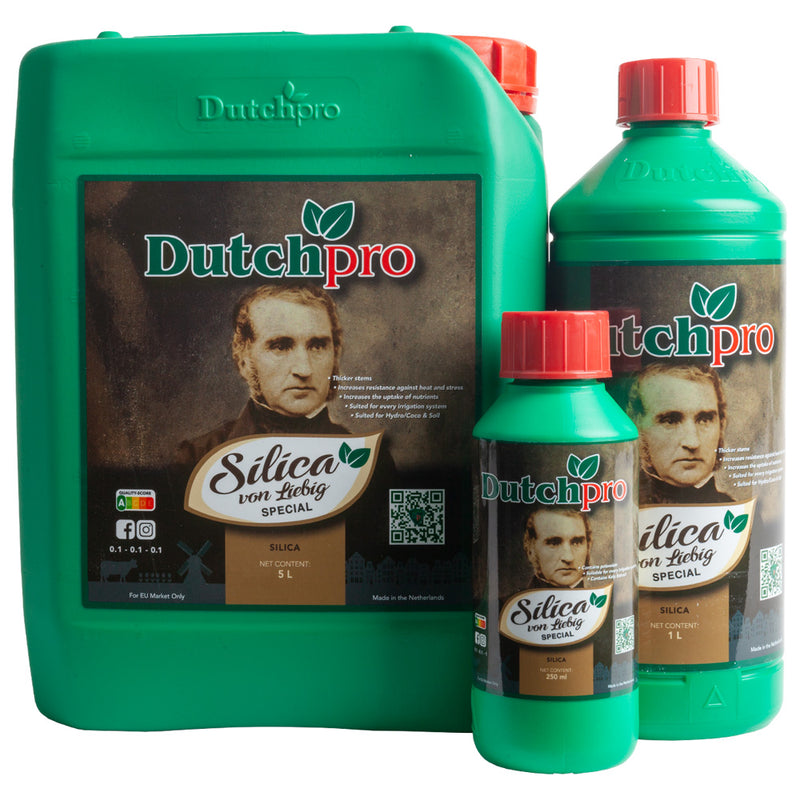 Dutch Pro Silica - Von Liebig’s Special is a powerful tool for maximizing yield and training plants to withstand stress. By utilizing silica, you can enhance nutrient absorption, strengthen stems, boost resistance against bacterial and fungal diseases, and reduce stress. Additionally, silica promotes optimal root development and accelerates overall growth. With its highly concentrated formula and utilization of nanotechnology, Dutch Pro Silica - Von Liebig’s Special ensures increased effectiveness.