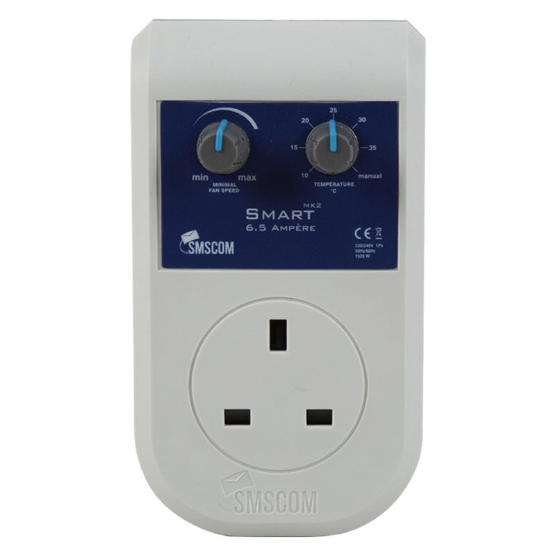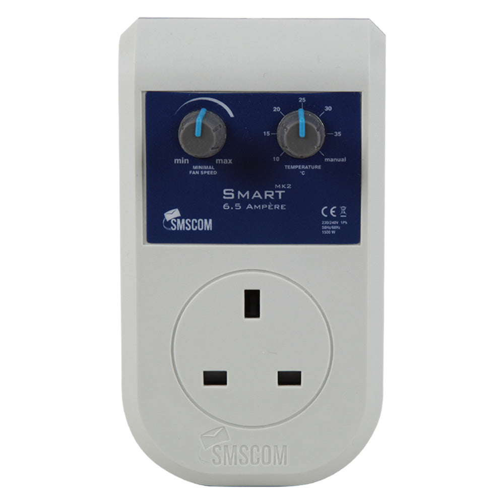 The SMSCom Plug-in Fan Speed Controller can manage fans with a maximum power consumption of 1500 Watts (6.5 Amps).